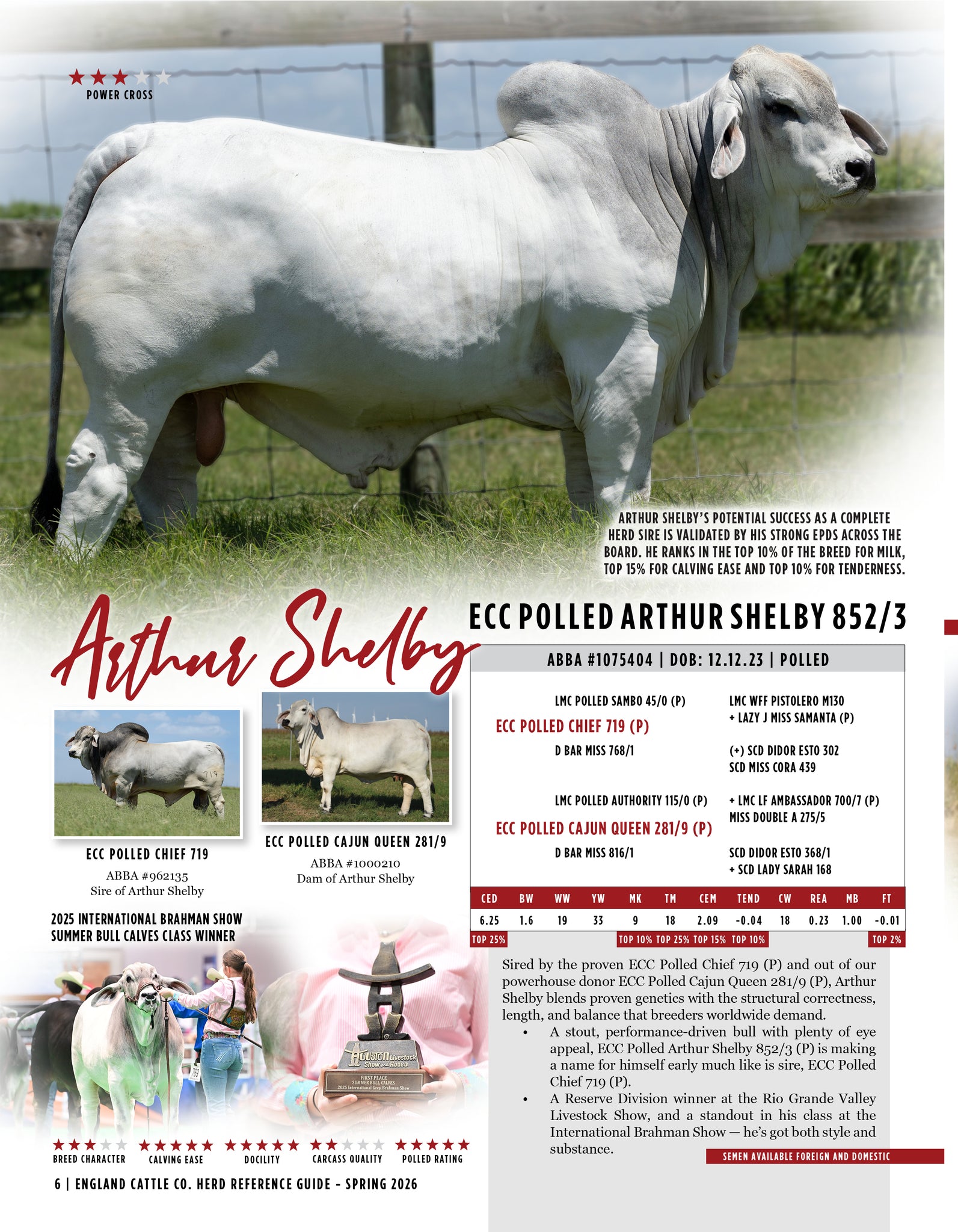 Sired by the proven ECC Polled Chief 719 (P) and out of our powerhouse donor ECC Polled Cajun Queen 281/9 (P), Arthur Shelby blends proven genetics with the structural correctness, length, and balance that breeders worldwide demand.